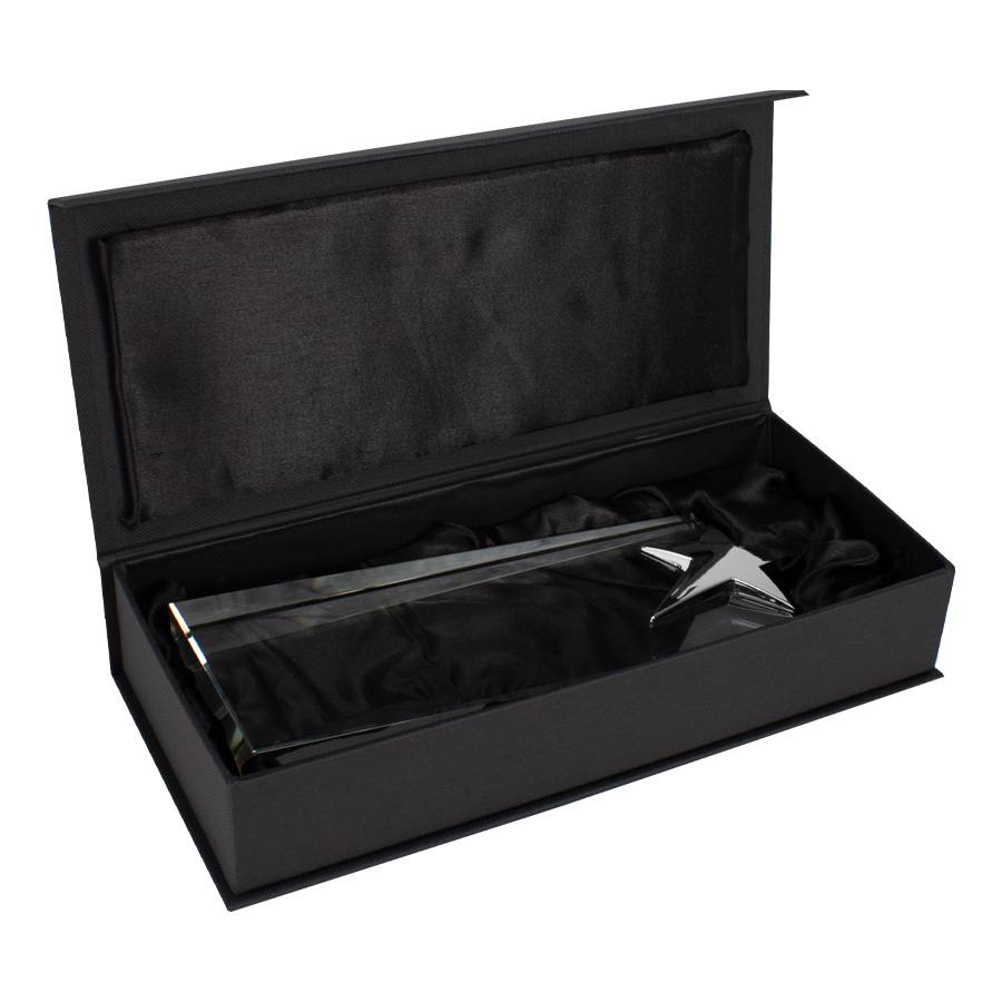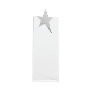 Elegante Trofeo Galvano de Cristal modelo «Ledecky», con estrella de acero inoxidable de color metalizado en su parte superior. Presentación en caja de cartón forrado negro con cierre imantado, interior acolchado de espuma y tela poliéster satinado negro, con troquel.