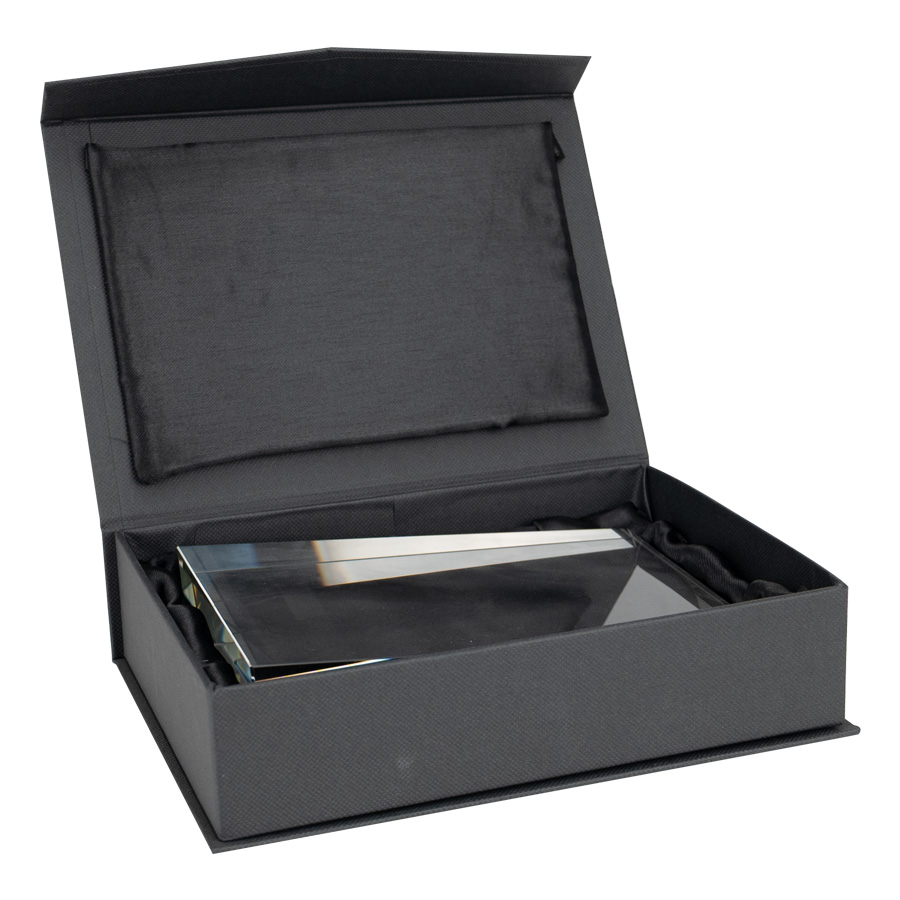 Elegante Trofeo Galvano de Cristal modelo «Syntec». Presentación en caja de cartón forrado negro con cierre imantado, interior acolchado de espuma y tela poliéster satinado negro, con troquel.
