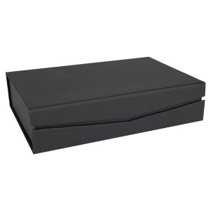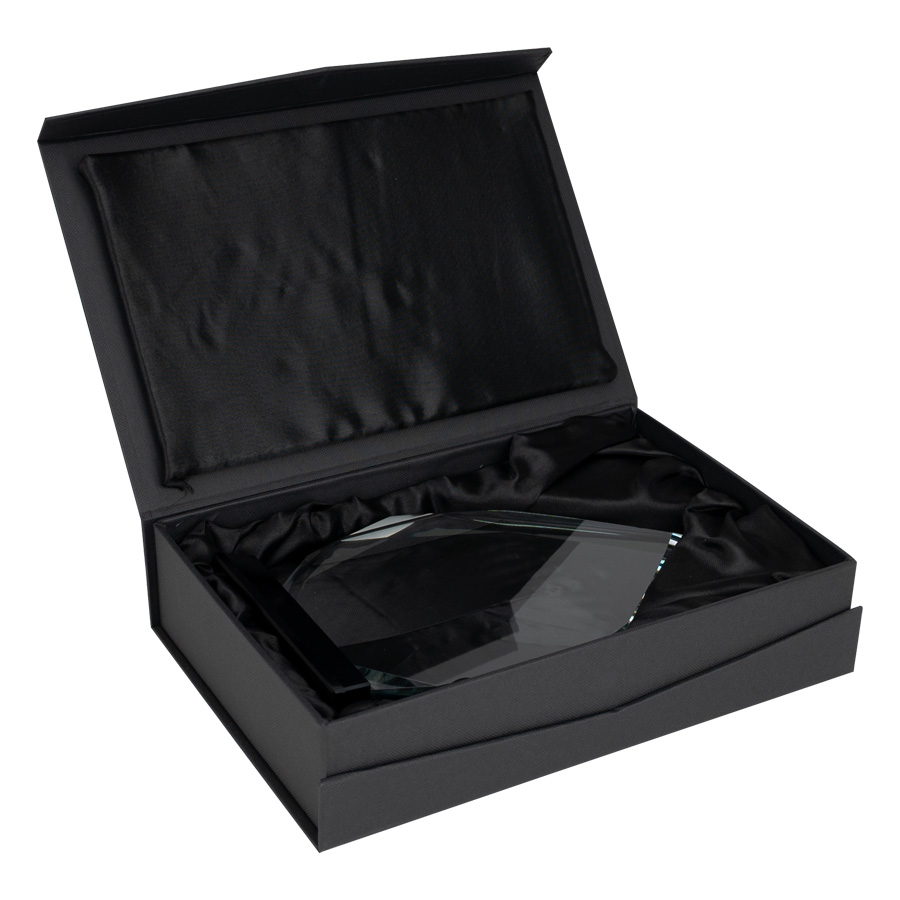 Elegante Trofeo Galvano de Cristal modelo «Tear», con base de cristal negro. Presentación en caja de cartón forrado negro con cierre imantado, interior acolchado de espuma y tela poliéster satinado negro, con troquel.