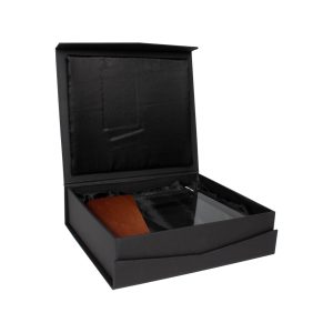 Elegante Trofeo modelo «Lewis», en madera barnizada y cristal. Presentación en caja de cartón forrado negro con cierre imantado, interior acolchado de espuma y tela poliéster satinado negro, con troquel.