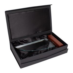 Elegante Trofeo modelo «Sail», base de madera barnizada y cuerpo de cristal con forma de vela. Presentación en caja de cartón forrado negro con cierre imantado, interior acolchado de espuma y tela poliéster satinado negro, con troquel.