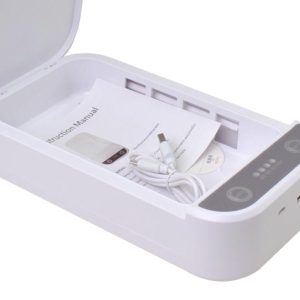 USB Caja Esterilizador UV portátil de color blanco, esterilización rápida y eficaz, eliminando bacterias en 3 minutos, se pueden desinfectar: celular, llaves, joyas, tarjetas bancarias y otros artículos pequeños. Contiene 2 tipos de rayos ultravioleta, basta con conectarlo a un puerto USB. A su vez, se puede agregar algunas gotas de esencia en los orificios interiores, para acompañar con un suave aroma mientras se esterilizan tus artículos de uso personal.