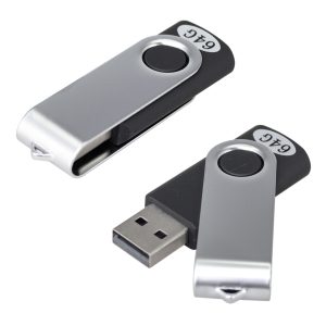 USB Pendrive 2.0 con 64GB de memoria, con carcasa metálica de giro. Presentación en caja de PVC translúcido.