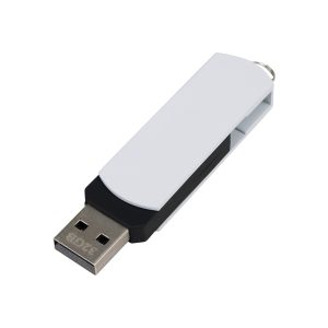 USB Pendrive 2.0 con 32GB de memoria, con cuerpo de silicona negra y carcasa metálica de giro de color, removible. Presentación en estuche de PVC translúcido.